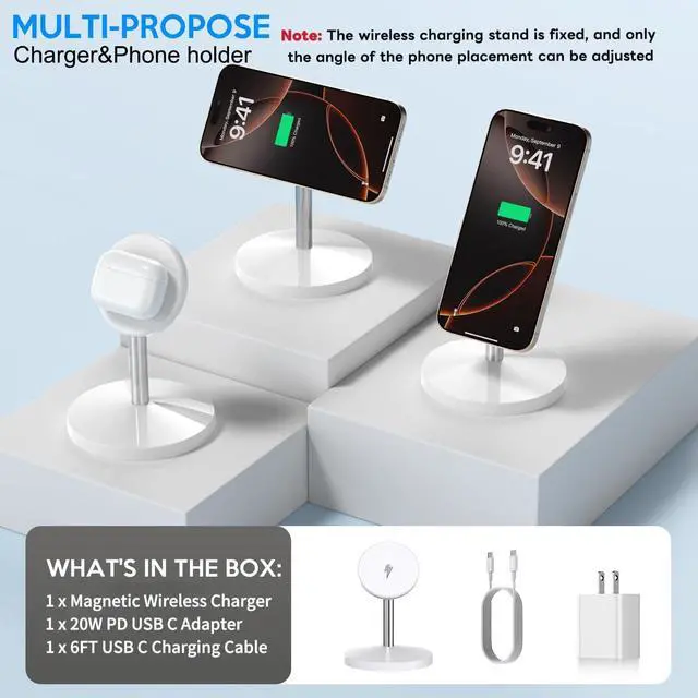 15W Magnetic Wireless Charging Stand (Equipped with PD Plug and 6FT White Data Cable)-Fast Charging with Multiple Safety Protection Systems