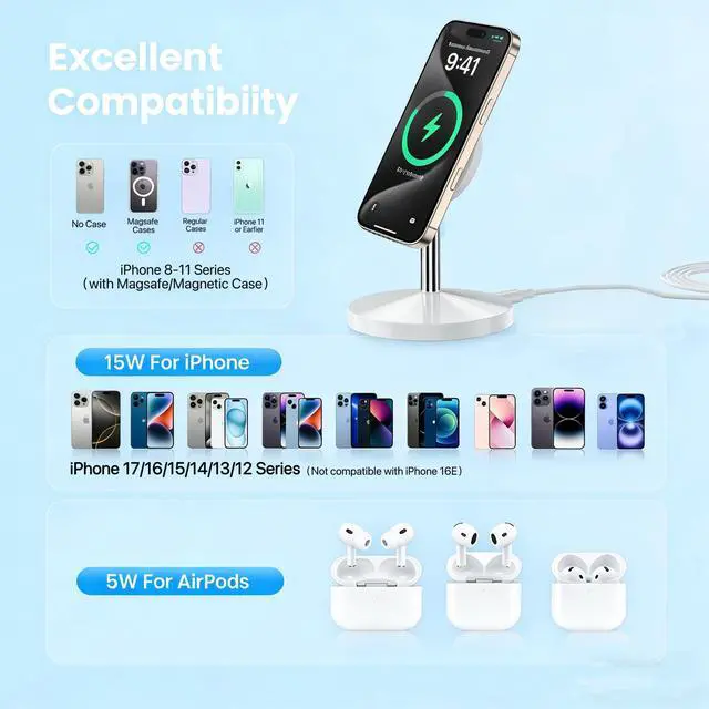 Note: This product is not compatible with iPhone 16E for charging. For iPhone 8-11 models, it requires a magnetic phone case to work.