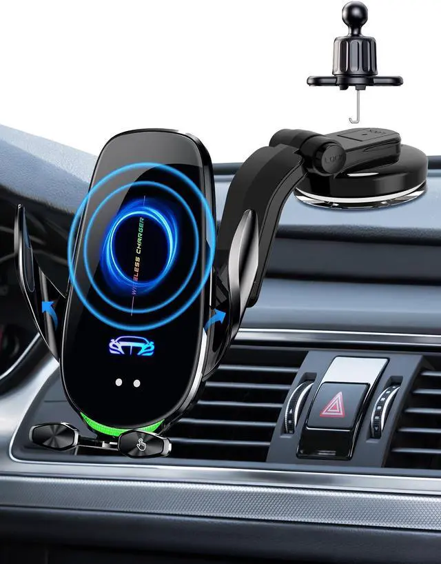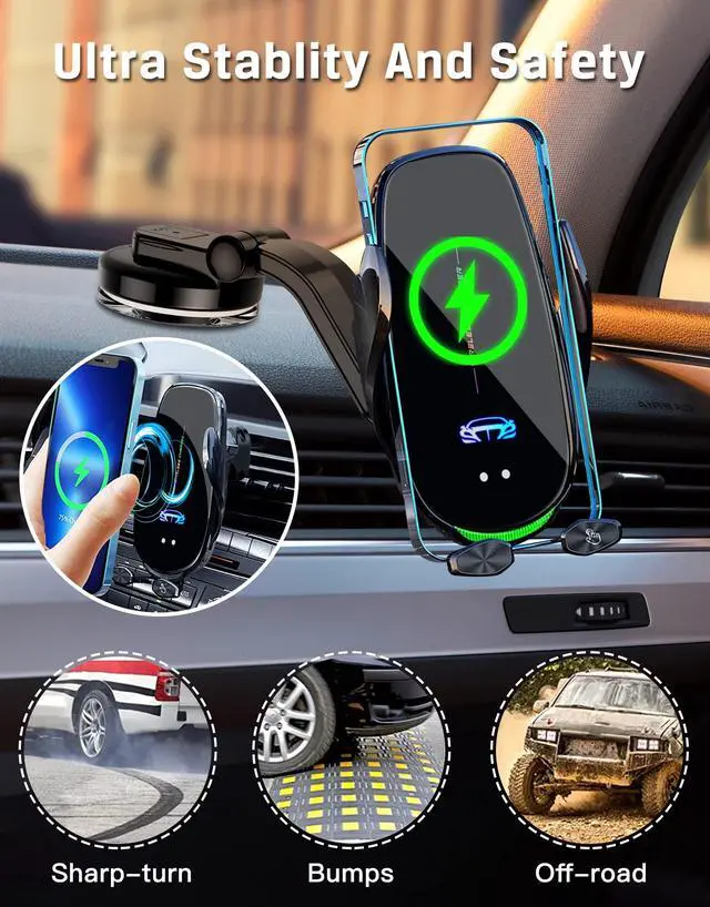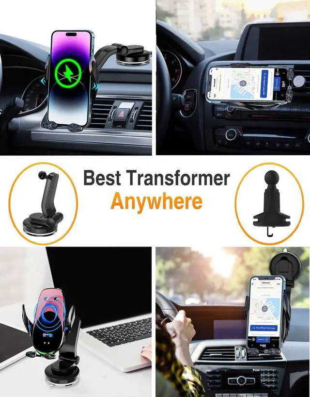The sticky suction cup + switch utilizes the vacuum principle to expel the internal air through pressure, which greatly enhances the suction power, and the wireless car charger bracket is firmly fixed on the dashboard and window. The car phone mount is designed with a 360° articulating ball, which can be easily adjusted to the right angle and can be easily used in horizontal, vertical or more layouts for navigation, phone calls, music listening and more.