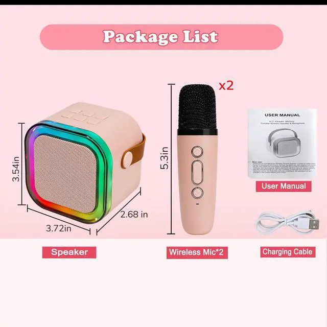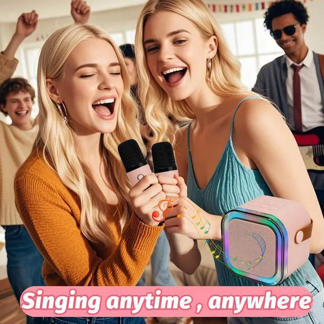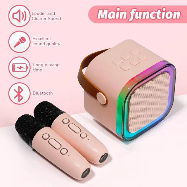 Mini Karaoke Speaker with 2 Wireless Microphones, Voice Effects, Led Lights, Portable Singing Machine for Ages 3, 4, 5, 6, 7, 8, 9, 10, 11, 12+ Years Old Girl Birthday Gift, Kids Karaoke Machine (Pink)