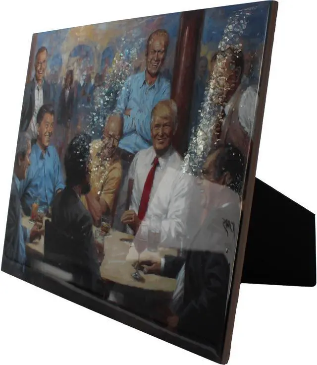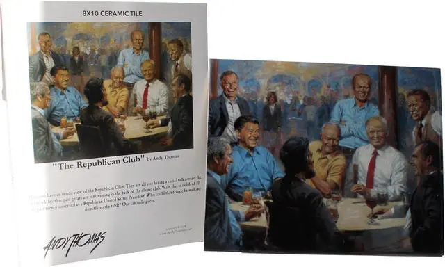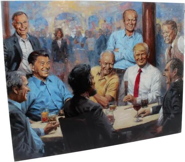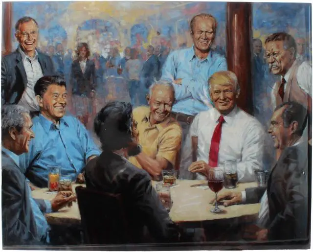 Here you have an inside view of the Republican Club. They are all just having a casual talk around the table while other past greats are reminiscing in the back of the classic club. Wait, this is a club of all the past men who served as a Republican United States President! Who could that female be walking directly to the table? One can only guess.