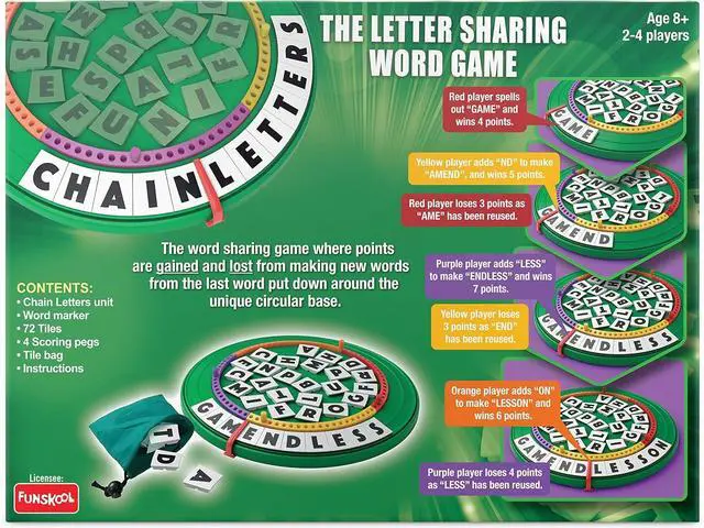 Chain Letters is an educational word game designed to boost vocabulary and verbal skills in children while offering fun for the whole family. Suitable for 2-4 players aged 8+, this game challenges players to form words from alphabet tiles, earning points for creativity and vocabulary. The set includes a circular board, scoring pegs, 72 tiles, and a convenient storage bag. It's perfect for improving language skills and offers hours of entertainment, making it an ideal gift for kids.
