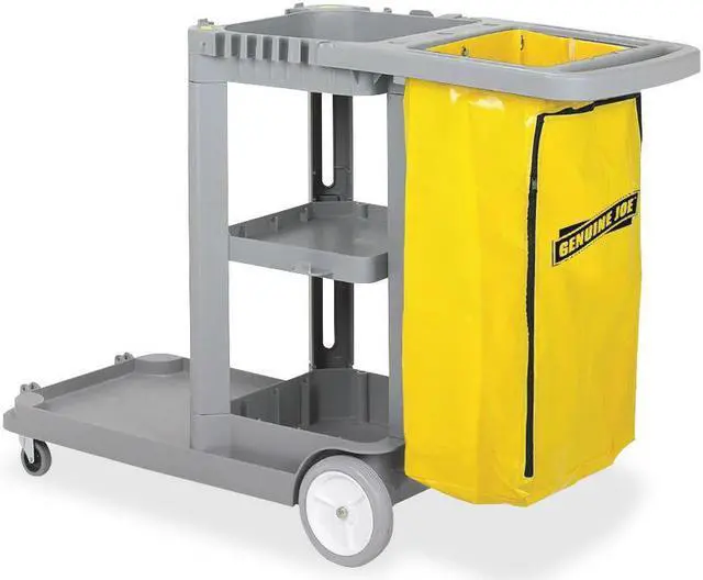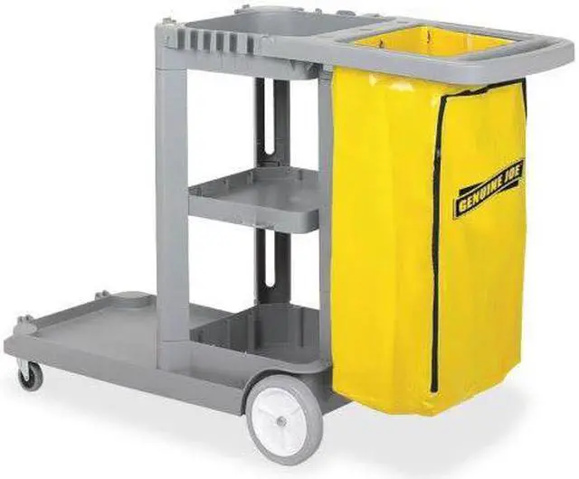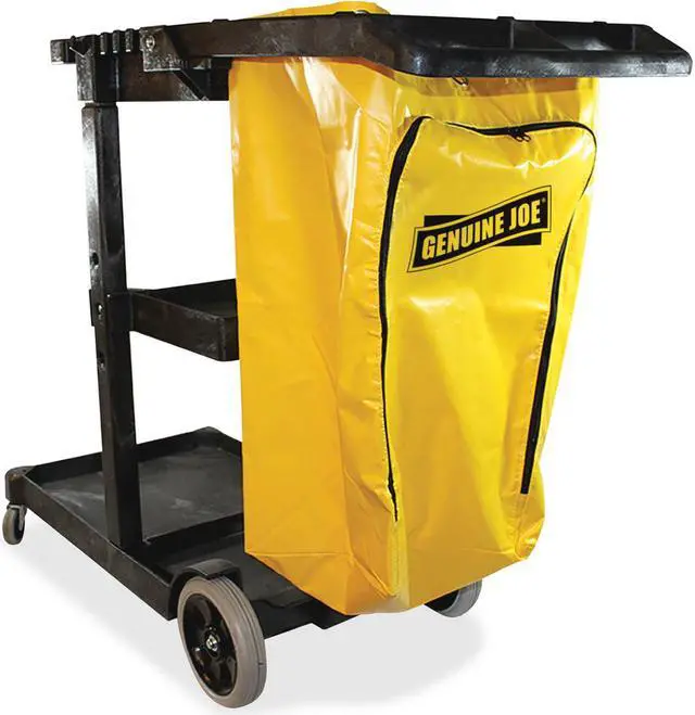 A workhorse of the industry, this janitor's cart is designed to accommodate and organize tools and supplies required by today's facilities managers. Oversized wheels and casters make it the choice for heavy-duty applications in healthcare, airports, convention centers, office buildings and more. Zippered vinyl bag is included. Use with Genuine Joe 60466 Bucket-Wringer Combo.