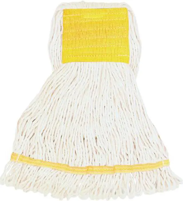 Small mophead with a wide headband is ideal for general cleaning and disinfecting. Synthetic blend fibers (rayon and cotton) absorb six to seven times their weight. Mop offers a limited break-in period so you can start mopping sooner. Looped ends provide greater durability and launderability. Wide headband allows added launderability and use with all handle styles.