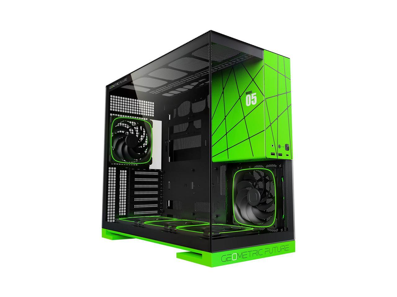 Geometric Future M5 Tempered Glass Mid Tower, E-ATX/ATX Gaming Case, 1.2mm Steel, Type C, Toolless Panels, Support 420/360 Radiator, ARGB PWM 140m fan x 5 Pre-Installed, Black/Green, GEO-M5F-BNY