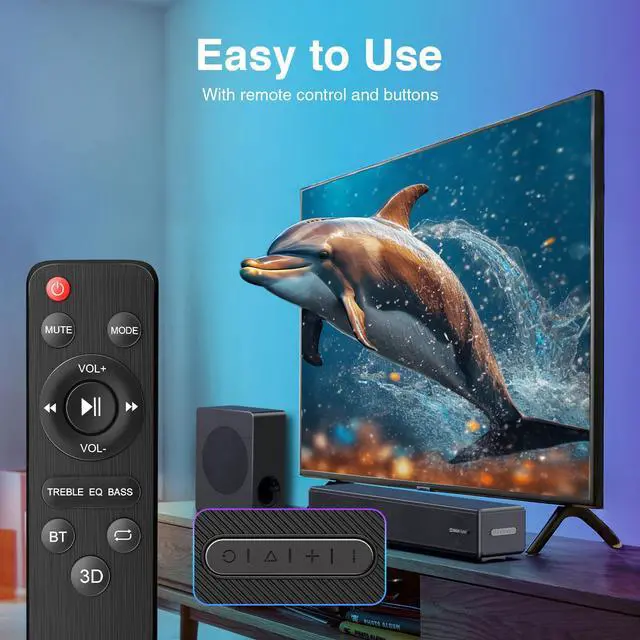 Take command of your sound with ease! This sound bar for smart tv comes with a convenient remote control for adjusting settings