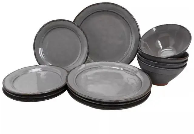 | Features | Gibson Elite Terranea 12 Piece Dinnerware Set, Grey Includes: 4 - 11in Dinner Plates 4 - 8.5in Dessert Plates 4 - 6.75in x 3.6in(H) Bowls |