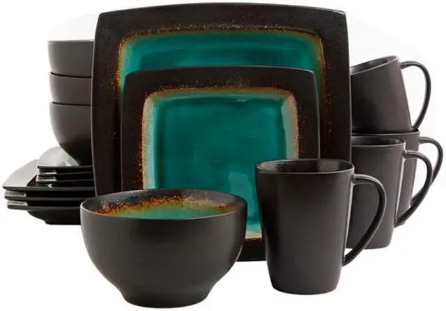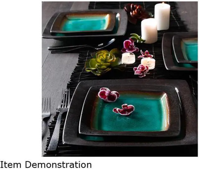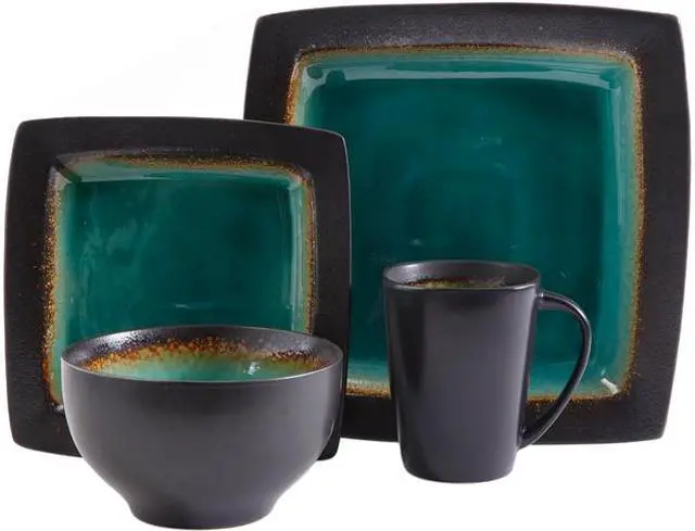 | Features | Dinnerware set complements existing kitchen decor Material: Stoneware, Finish: Reactive glaze Dimensions: 10.5" Dia. dinner plates, 8" Dia. dessert plates, 5.7" Dia. bowls, 14 oz. mugs Design: Ocean paradise, Color: Jade, Shape: Square Serves up to 4 Contemporary dinnerware set Set includes: Four dinner plates, four dessert plates, four bowls and four mugs |