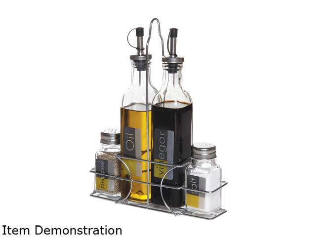 Includes 2 10 inch high oil and vinegar bottles, two 3.5 inch salt and pepper shakers and a wire caddy