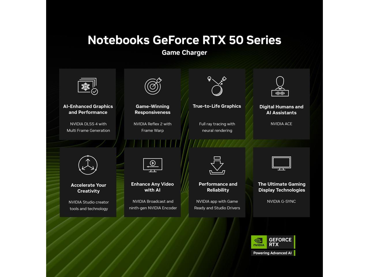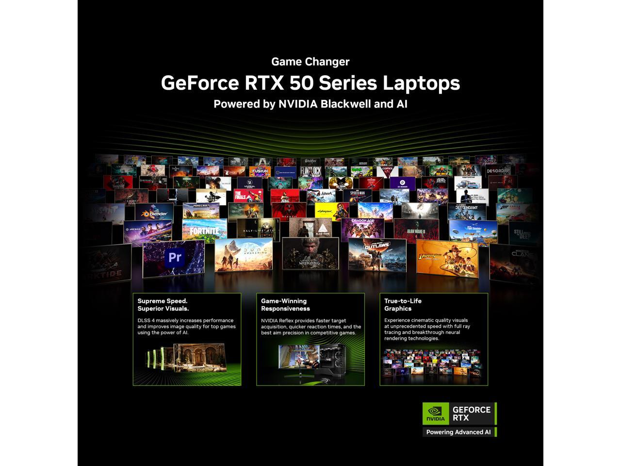 - NVIDIA GeForce RTX 5090 Laptop GPU – Powered by NVIDIA Blackwell, GeForce RTX 5090 Laptop GPUs bring game-changing capabilities to gamers and creators. Equipped with a massive level of AI horsepower, the RTX 50 Series enables new experiences and next-level graphics fidelity. Multiply performance with NVIDIA DLSS 4, generate images at unprecedented speed, and unleash your creativity with NVIDIA Studio.