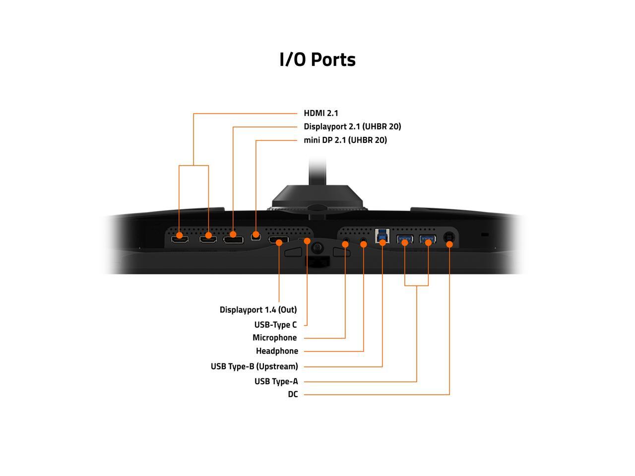 - Connectivity: 2x HDMI 2.1, 1x Displayport 2.1 (UHBR 20), 1x mini DP 2.1 (UHBR 20), 1x USB Type-C, 2x USB 3.2 Downstream ports, 1x USB 3.2 Upstream port, 1x Earphone Jack, 1x Microphone Jack