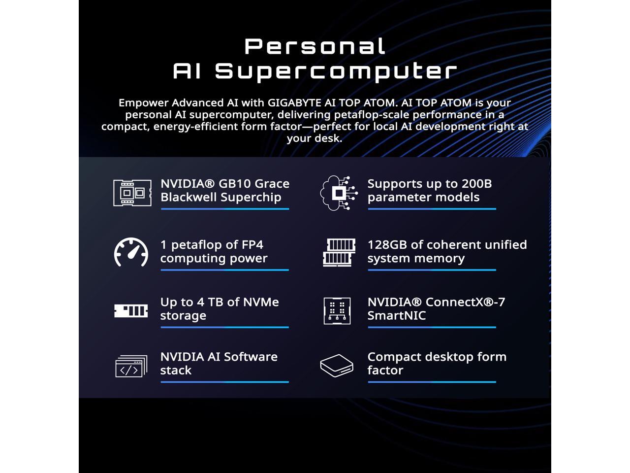 GIGABYTE AI TOP ATOM Personal AI Supercomputer, Arm Cortex-X295 + Cortex A725, NVIDIA Blackwell Architecture, 128GB LPDDR5X, 4TB PCIe 5.0 NVMe SSD, NVIDIA DGX OS, Black