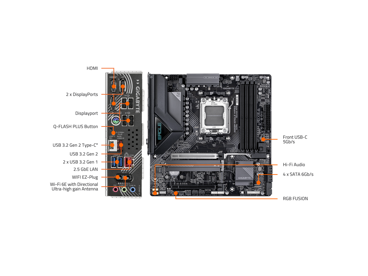 GIGABYTE B850M EAGLE WIFI6E AMD AM5 Motherboard, M-ATX, DDR5, 2x M.2, PCIe 5.0, USB-C, USB 3.2 Gen 2, WIFI6E, 2.5GbE LAN, EZ-Latch, Wi-Fi EZ-Plug