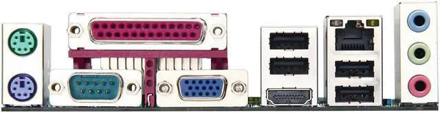USB Chipset: Up to 8 USB 2.0 / 1.1 ports (4 ports on the back panel, 4 ports available through the internal USB headers) Internal I/O Connectors 1 x 24-pin ATX main power connector 1 x 4-pin ATX 12V power connector 4 x SATA 3Gb/s connectors 1 x CPU fan header 1 x system fan header 1 x front panel header 1 x front panel audio header 1 x S/PDIF Out header 2 x USB 2.0 / 1.1 headers 1 x chassis intrusion header 1 x power LED header 1 x Clear CMOS jumper Back Panel Connectors 1 x PS/2 keyboard port 1 x PS/2 mouse port 1 x parallel port 1 x serial port 1 x D-Sub port 1 x HDMI port 4 x USB 2.0 / 1.1 ports 1 x RJ-45 port 3 x audio jacks (Line In/Line Out/Microphone) I/O Controller iTE I/O Controller Chip H/W Monitoring System voltage detection CPU/System temperature detection CPU/System fan speed detection CPU overheating warning CPU/System fan fail warning CPU/System fan speed control (Note 3)