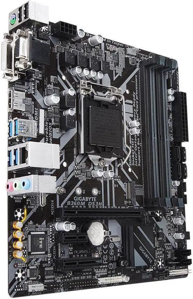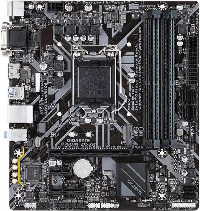 Intel B360 Ultra Durable motherboard with GIGABYTE 8118 Gaming LAN, PCIe Gen3 x4 M. 2, 7 colors RGB LED strips support, Anti-Sulfur Resistor, Smart Fan 5, DualBIOS, CEC 2019 ready. Supports 8th Gen Intel Core Processors Dual Channel Non-ECC Unbuffered DDR4 Hybrid Digital PWM Design High Quality Audio Capacitors and Audio Noise Guard with LED Trace Path Lighting Ultra-Fast M. 2 with PCIe Gen3 X4 & SATA interface RGB Fusion supports RGB LED strips in 7 colors