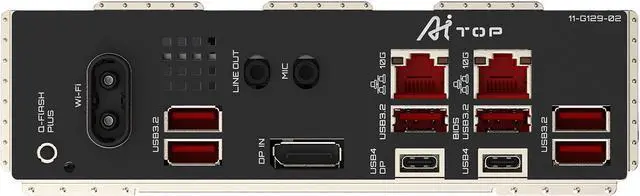| Back I/O Ports | 1 x Q-Flash Plus button 2 x SMA antenna connectors (2T2R) 1 x DisplayPort In port 1 x USB4 USB Type-C port (DisplayPort) 1 x USB4 USB Type-C port 6 x USB 3.2 Gen 2 Type-A ports (red) 2 x RJ-45 port 2 x audio jacks |