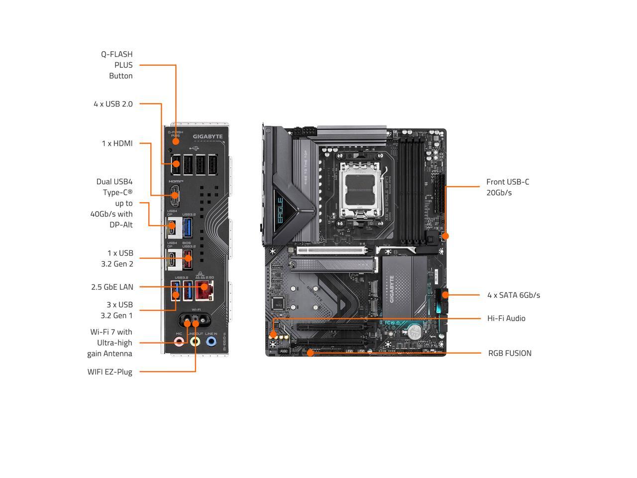 GIGABYTE X870 EAGLE WIFI7 AM5 LGA 1718, ATX, DDR5, 4 x SATA 6Gb/s, 3x M.2, PCIe 5.0, USB4, Wi-Fi 7, 2.5GbE LAN, EZ-Latch, 5-Year Warranty