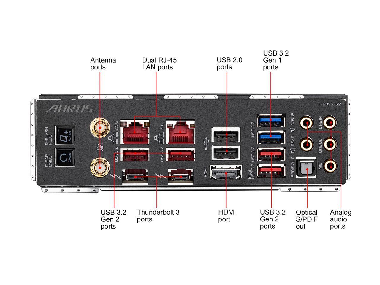 - Rear 4 x USB 3.2 Gen 2 Type A, 2 x Thunderbolt 3 Type C, 2 x USB 3.2 Gen 1 Type A, 2 x USB 2.0