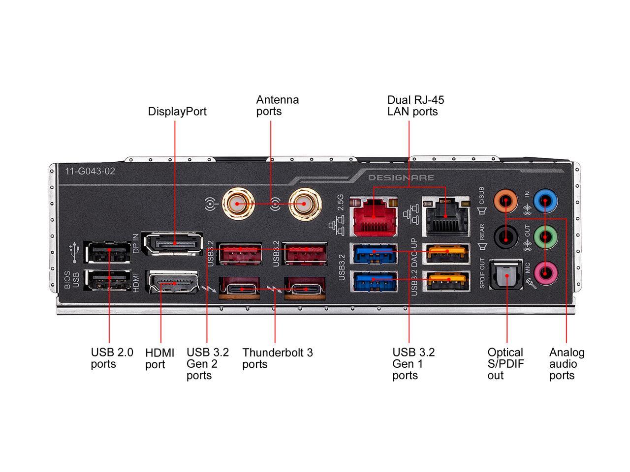 Rear - 2 x USB 3.2 Gen2 (A), 2 x USB 3.2 Gen2 (C) (Thunderbolt), 4 x USB 3.2 Gen1, 2 x USB 2.0