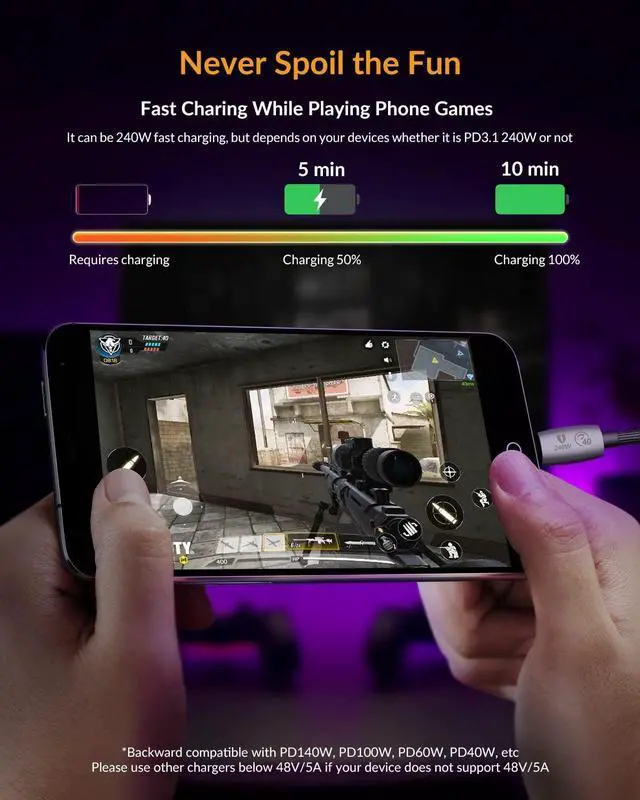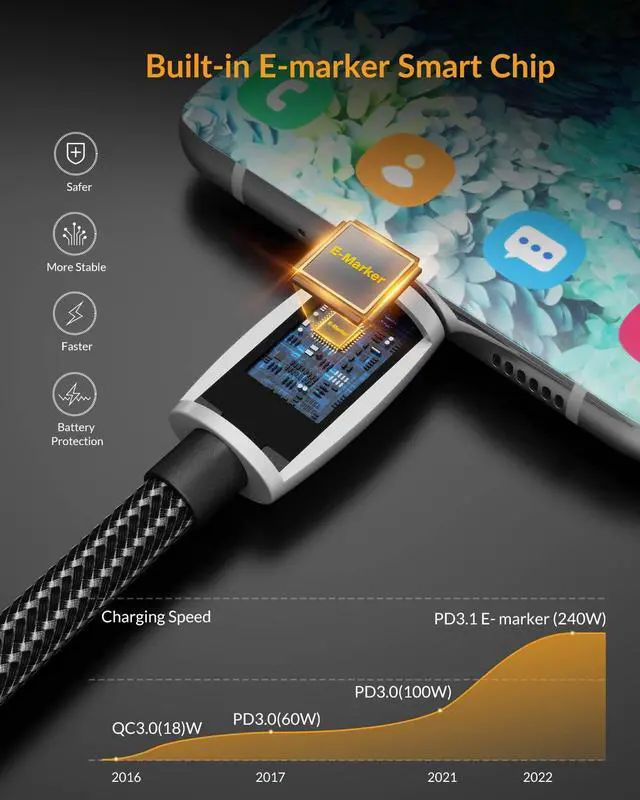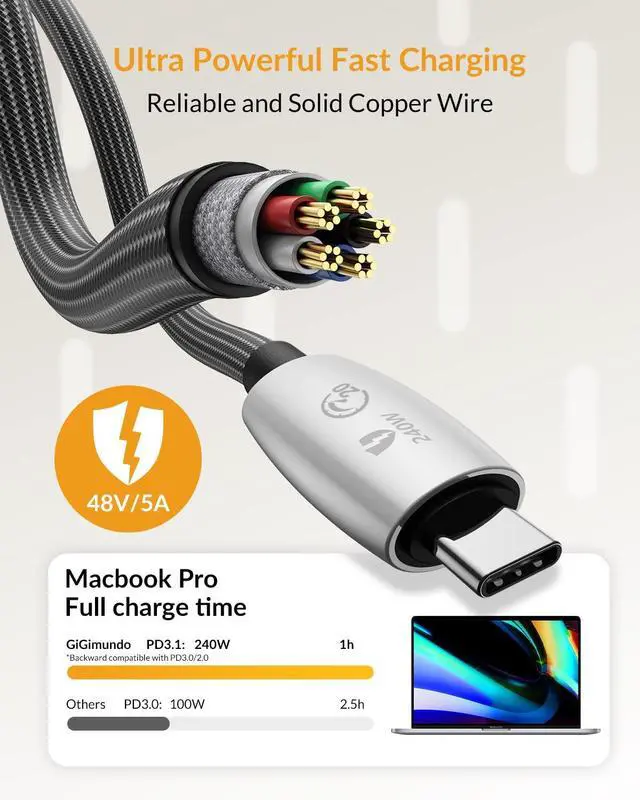 240w USB C CableGiGimundo usb c fast charging cable features with built-in 240w E-Marker intelligent chip, USBC TO C cable delivers stable secure 48V 5A output to charge your device at a blazing-fast speed