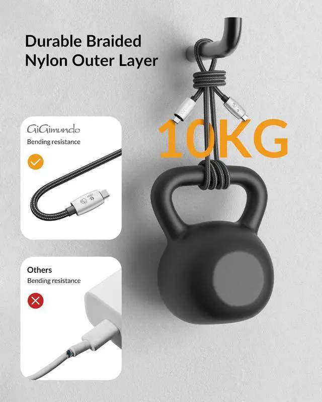 Solid and DurableThis long usb c cable is made of double premium nylon braided cord, USB 4 cable is thick with stronger abrasion resistance which provides 15,000+ bend lifespan and prevents tangling