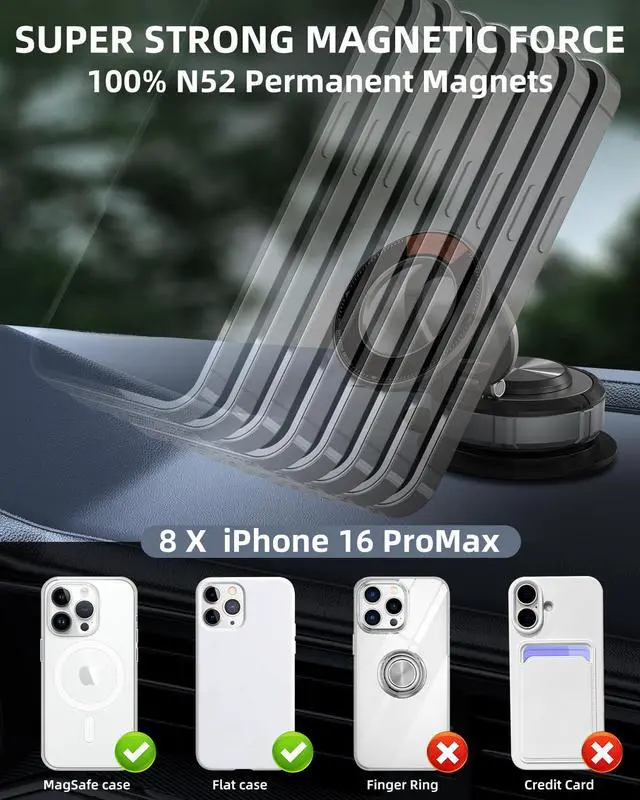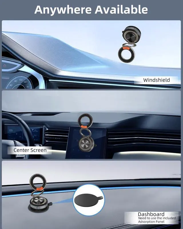 Multi-Scene VersatilityMore than just a car phone mount for dashboards, windshields, and center console screens, this suction cup phone mount adapts seamlessly to indoor spaces like gyms, kitchens, and offices as a magnetic phone stand.Warm Tips On smooth surfaces (glass, tiles, etc.), the suction cup adheres directly. For textured surfaces (leather-textured dashboards, refrigerator sides, etc.), first apply the included adhesive plate for car dashboards or adhesive pad for indoor use), then attach the suction cup to the plate/pad for secure mounting.