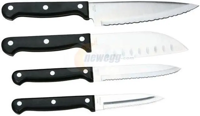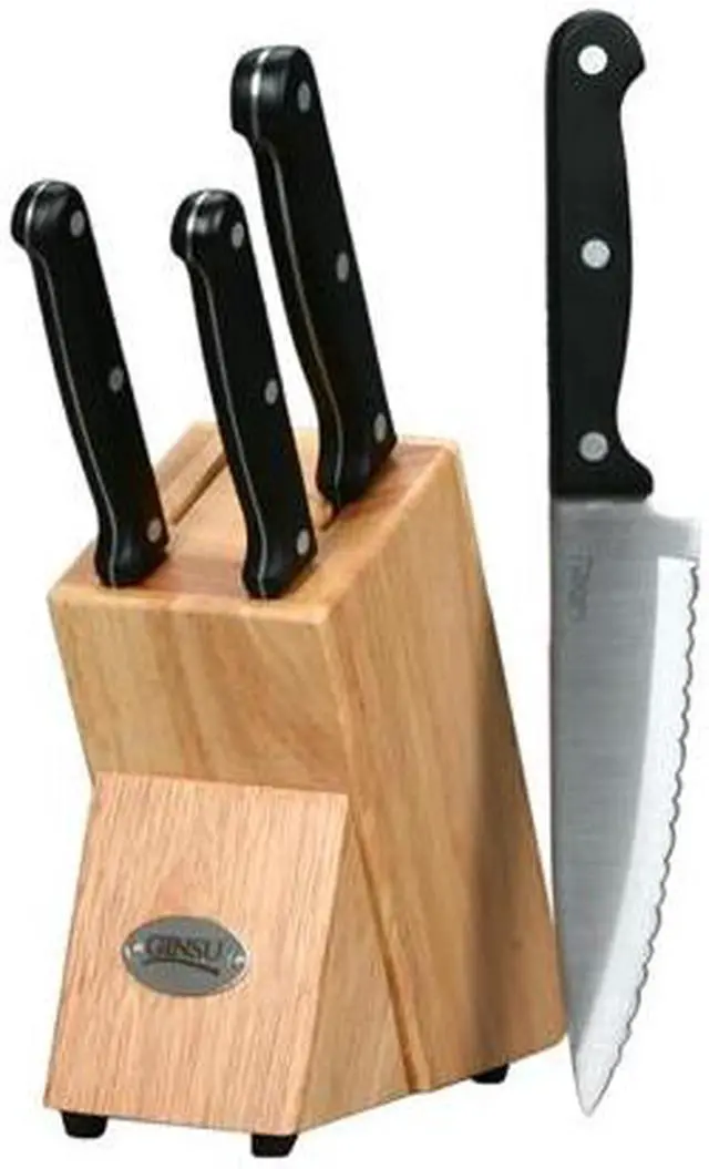| Features | Japanese Steel Ginsu Essentials Series blades are made from commerical quality Japanese Stainless Steel, known for it's strength and durability. Serrated edges ensure a lifetime of use without needing sharpening. Each handle is beautifully haped and ergonomically designed to fit smoothly into your hand. Japanese steel tang extends into the handle. |