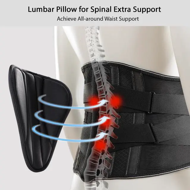 ADDED LUMBAR PILLOW & PERFECT FIT: This lumbar support brace offers a removable 3D lumbar pillow for different body types, which helps the back support belt hits just right at the lower back for those small people, plus this lumbar pillow provides deep muscle compression to reduce muscle fatigue and improve blood circulation. The back support comes in 5 sizes, please choose the right size according to the size chart before placing an order, and choose the large size between two sizes