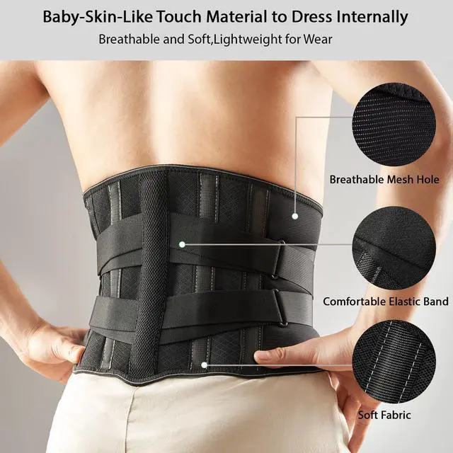 INSTANT LOWER BACK PAIN RELIEF : Higher stiffness aluminum stays provide strong support for your lower back, and the high-quality adjustable compression straps helps releasing tension on the lower back, this back brace stabilizes the lumbar spine bones and muscles and relieves low back pain for people with a bulged or herniated disc, sciatica, compressed disc, lordosis, and many other acute (or chronic) lumbar issues