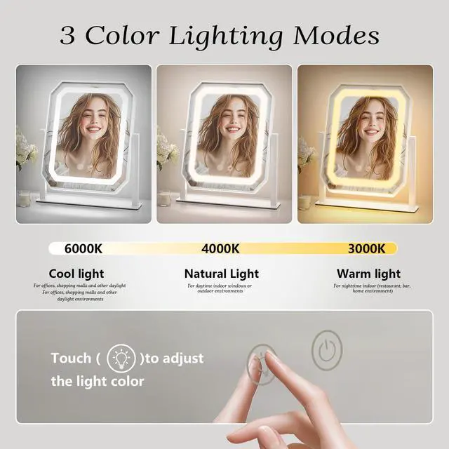 3 Color Lights : The hollywood lighted makeup mirror offers 3 lighting modes (warm light, natural light, or cool light).