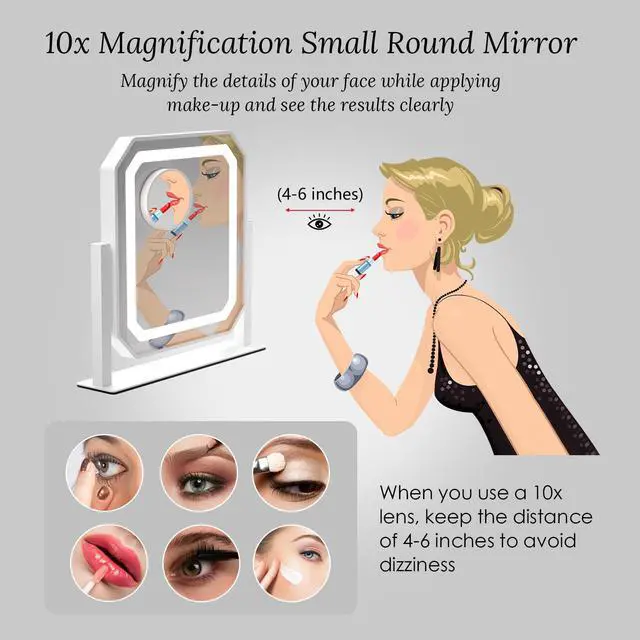 Detachable 10X Magnification Mirror: The lighted makeup mirror comes with a 3.5" detachable magnifying mirror .