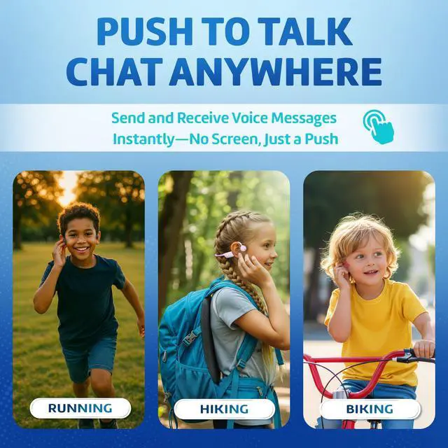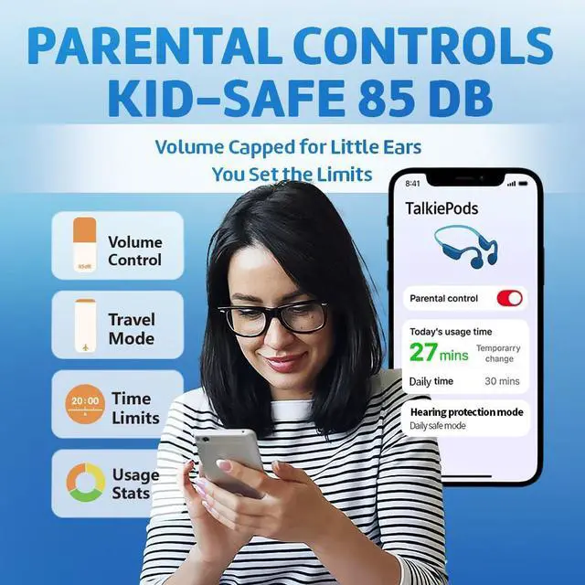 Talkie Messages Keep You Close, with Parental Controls (via app) With the app, Push-to-Talk Talkie sends and receives short family voice messagesscreen-free, tap-to-reply. In-app parental controls let you view usage stats, set time limits/quiet hours, and enable a temporary Travel Mode (up to 94 dB) for noisy places; it auto-returns to 85 dB.
