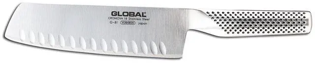 Experience effortless vegetable prep with the Global 7-inch Hollow Ground Vegetable Knife, designed for seamless chopping and minimal food stickiness. Its broad, sturdy blade is perfect for handling vast quantities of vegetables, while the hollow ground edge ensures slices glide off without clinging. Crafted from the finest CROMOVA 18 stainless steel, this knife promises enduring sharpness, superior balance, and resistance to rust and corrosion, making it an indispensable tool in any kitchen.