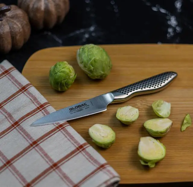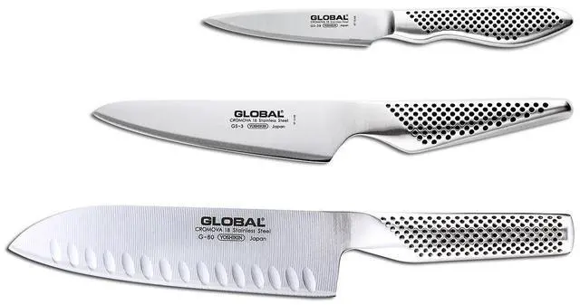 The Global 3 Piece Knife Set includes three essential knives for versatile kitchen prep: the G-80 7-inch Hollow Ground Santoku Knife, GS-3 5-inch Cooks Knife, and GS-38 3.5 -inch Paring Knife. Made from high-quality stainless steel, these knives offer lightweight balance and precise control for slicing, chopping, and detailed tasks. Ideal for everyday cooking and professional-level performance.