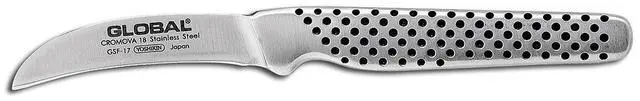 Elevate your prep game with the Global 2-1/4" Bird's Beak Peeling Knife! This Japanese-crafted gem boasts a unique curved blade that glides effortlessly over fruits and vegetables, minimizing waste and maximizing precision. Crafted from ultra-sharp, ice-hardened Cromova 18 stainless steel, it holds a razor-sharp edge, while the ergonomic, dimpled handle ensures comfortable control. Peel, shape, and garnish with ease, from delicate kiwis to hearty potatoes. Experience the difference of Global quality - a lifetime of effortless food prep awaits!