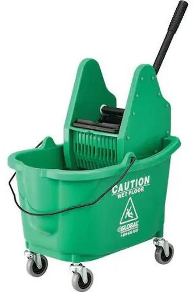 Down Press Mop Bucket And Wringer Combo, Yellow. Made using corrosion resistant polypropylene with electroplating material for a structural finish. Offers a 9.5 gallon capacity. Mop bucket easily maneuvers on non-marring 3 diameter swivel casters. Wringer features a comfort grip handle for easy, efficient mop squeezing. Sediment screens trap dirty residue to keep the mop and water clean longer.