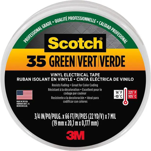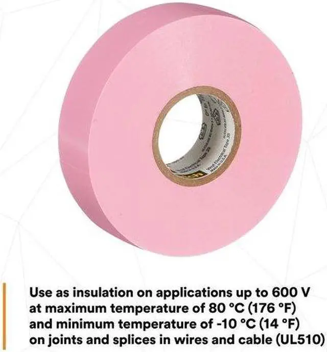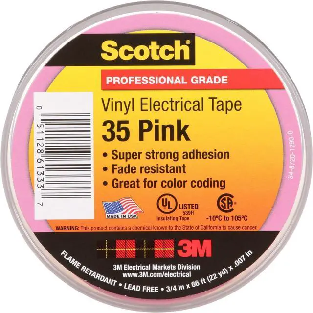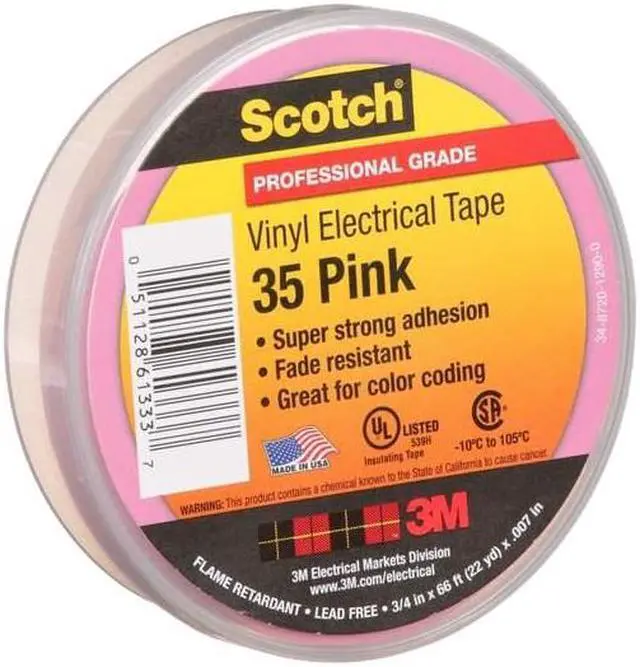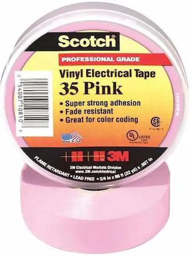 Electrical Tape, Tape Backing Material PVC, Tape Adhesive Rubber, Tape Thickness 7.0 mil, Tape Width 3/4 in, Tape Length 66 ft, Tape Shape Continuous Roll, Tape Color Pink, Max. Voltage 600, Min. Tape Performance Temp. 30 Degrees F, Max. Tape Performance Temp. 220 Degrees F, Tape Tensile Strength 20 lb-in, Tape Adhesive Strength 17 oz/in, Tape Core Diameter 1 1/4 in, Tape Elongation 225 Percent, Series 35, UV Resistance No, Standards CSA Certified, RoHS 2011/65/EC, UL 510, UL Listed.