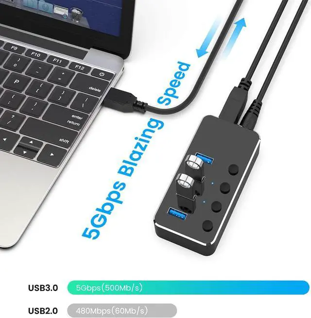 This powered USB hub has 4 individual on/off switches to control each USB port. The USB 3.0 splitter saves the trouble of unplugging devices whenever you don't need it. Turn on/off the port at your need.