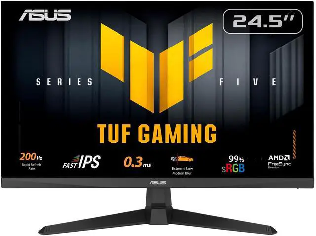 The 24.5 -inch TUF Gaming VG259Q5A Full HD gaming monitor featuring a Fast IPS panel for blistering-fast 200 Hz gaming. ASUS Extreme Low Motion Blur and AMD FreeSync (tm) Premium, G-SYNC compatible (under processing), VESA AdaptiveSync technologies enables buttery-smooth gaming. In addition, it has a 99% sRGB gamut to offer exceptional colors and contrast. Gaming key spec | 200HZ REFRESH RATE AND 0.3MS (gtg) RESPONSE TIMEWith 200Hz refresh rate decimates lag and motion blur to give you the upper hand in first person shooters, racers, real-time strategy, and sports titles.