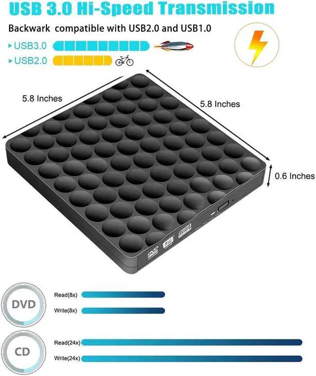 • [Plug and Play] Powered by USB 3.0 / USB C port. No external driver or power supply is required. Just plug it into your device and the DVD drive will be detected.