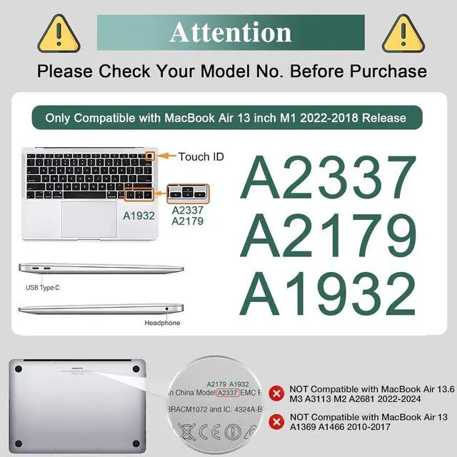 Model Numbers: A2337 M1 / A2179 / A1932. Not fit to 2010-2017 Old Air 13.3 inch WITHOUT Touch ID A1466/A1369 (logo can shine through). Please kindly check your laptop model first before purchase.