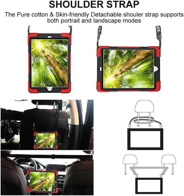 Adjustable removable shoulder straps --- Attach strap to any two holes to carry your device vertically or horizontally like a messenger bag / neck bag.... Adjustable strap length can adjust up to 5ft for to get the most comfortable fit. allows you to display your tablet behind one seat for personal viewing or between two seats for shared viewing.