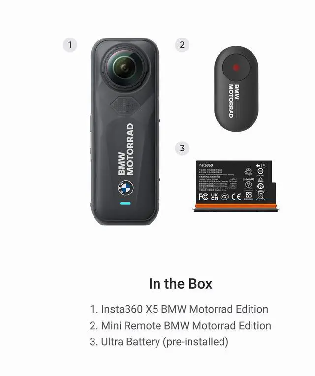 Insta360 X5: All day. All night. All angles. A shared passion to push limitsCapture the thrill of the open road with Insta360 X5 and BMW Motorrad. From an exclusive Mini Remote and Ultra Battery to a custom Stats Dashboard, every element embodies the spirit of adventure, turning your rides into unforgettable stories - #NeverStopChallenging. Why choose insta360 X5 BMW Motorrad edition? 8K30fps 360 Degree Video with Dual 1/ 1.28" SensorsLarger 1/ 1.28" sensors capture more light for brighter, richer visuals and mind-blowing 8K30fps 360 Degree videoTriple AI Chip for Superior Low LightAn industry-first triple AI chip and new PureVideo mode deliver incredible breakthroughs in 360 Degree low light shootingEasy ReframingChoose the best angles after recording with AI-powered reframing tools in the Insta360 appBMW Motorrad Mini RemoteWith an exclusive BMW Motorrad design, control X5 remotely as you ride and quickly switch up the view in InstaFrame ModeInvisible Selfie Stick + Plate BlurCapture third-person angles that are impossible with other action cameras, no stick in sight, and protect your privacy with automatic license plate detection and blurPowerful Ultra BatteryThe pre-installed 2800mAh battery offers up to 235 minutes in smart power-saving Endurance Mode and a 17% capacity increase compared to the regular X5 battery.