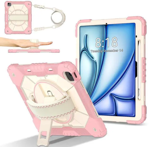 WERLEO Case for iPad Air 13 Inch M3/M2 2025/2024 with Rotating Stand Pencil Holder Hand/Shoulder Strap, Heavy Duty Shockproof Protective Cover Rose Gold