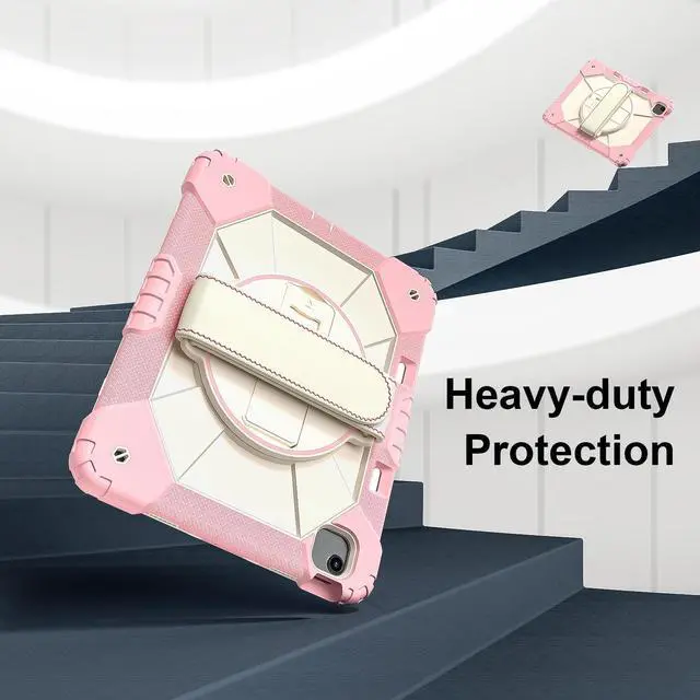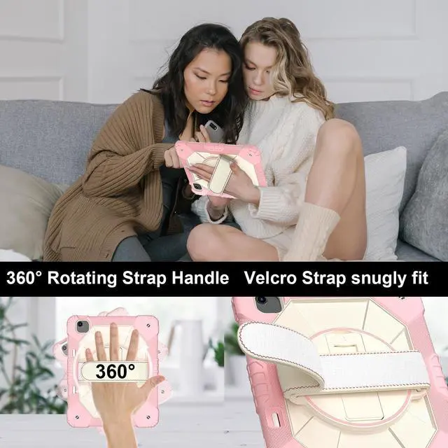 Built-in 360 Rotatable Kickstand + Hand Strap : 360-degree rotating swivel stand supports position of 3 angles(Vertical, Horizontal, and Halfway between), ideal for watching videos, conferences and travelling. Soft rotating handle strap prevents falling of tablet, featuring convenient use for school teachers, students, waiters, doctors, nurses and conference presenters.