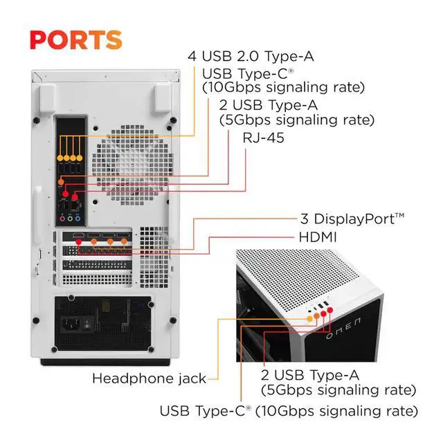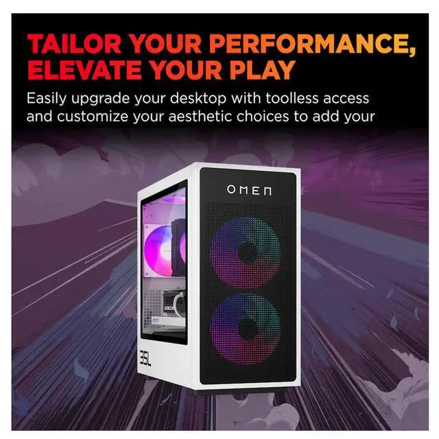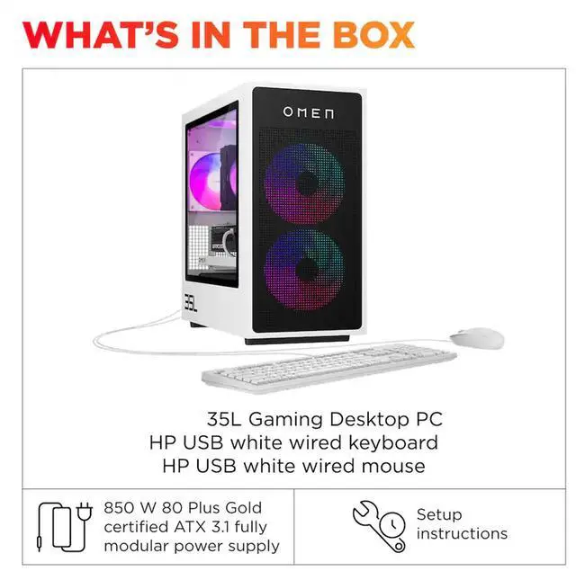Model: HP OMEN 35LForm/Style: TowerProcessor: Zen 4 Gen Ryzen 7 8700F 4.1GHz Processor (upto 5 GHz, 16MB Cache, 8-Cores, 16-Threads, )Memory: 32GB DDR5 DIMMGraphics: NVIDIA GeForce RTX 5070 12GB GDDR7 Dedicated Graphics, VR Ready Storage: 256GB PCIe SSD (Solid State Drive) + 1TB HDD (Hard Disk Drive)Operating System: Windows 11 Home-64Display: Connectivity: 802.11ax Wifi, Bluetooth 5.4, RJ-45Ports/Slots:, 4 USB 2.0, HDMI, 3 Display Port, 2 USB 3.2 Type-C, 1 x Headphone/Microphone Combo JackInput/Output:, White, USB Keyboard, USB Mouse, Battery: 850W PSU, Other Features RGB Lighting, Color: Panda MetalWeight: 28.8lbProduct Dimensions (WxLxH): 16.6 IN x 16.75 IN x 8.25 IN1 Year Manufacturer warranty from Velztorm (Professionally upgraded by Velztorm)
