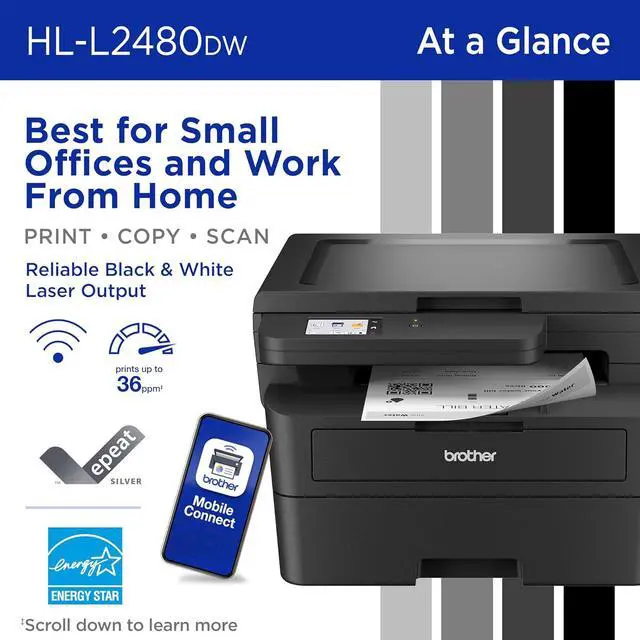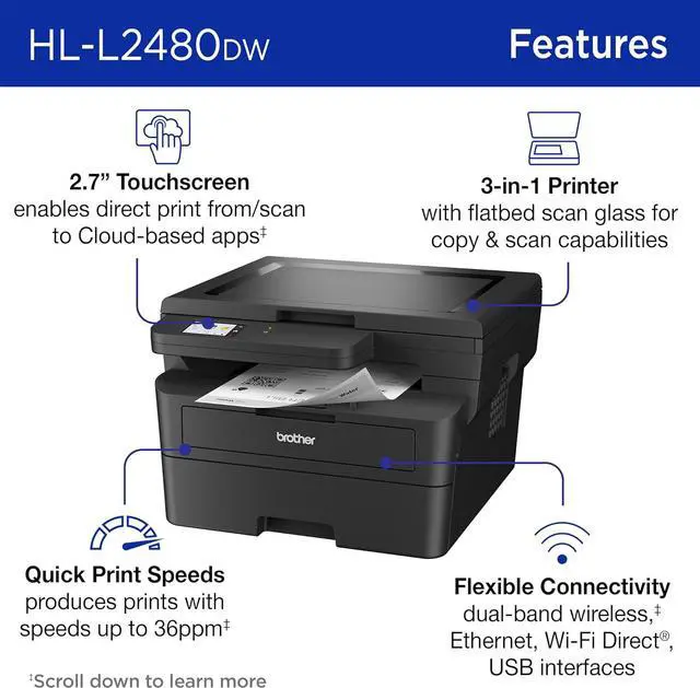Brother HL-L2480DW Wireless Compact Monochrome Multi-Function Laser Printer with Copy and Scan, Duplex, Mobile, Black & White