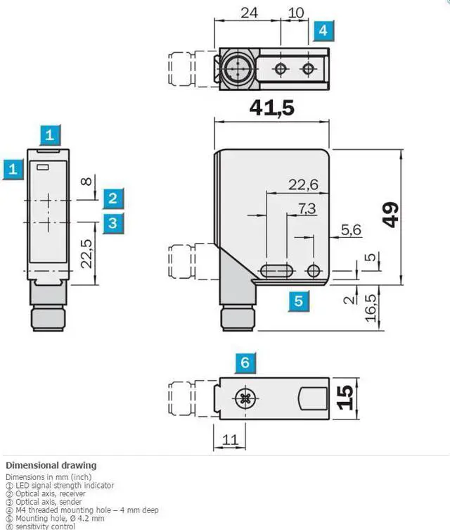 FEATURES Sensor/ detection principle Photoelectric proximity sensor, Background suppression Dimensions (W x H x D) 15 mm x 49 mm x 41.5 mm Housing design (light emission) Rectangular Sensing range max. 10 mm... 1, 000 mm 1) Sensing range 80 mm... 800 mm 1) Type of light Visible red light Light source LED Adjustment Potentiometer MECHANICS/ELECTRONICS Supply voltage 10 V DC... 30 V DC Ripple = 5 Vpp Power consumption = 30 mA 1) Switching output PNP Switching mode Light/dark switching Response time = 330 µs 2) Connection type Male connector M12, 4-pin Housing material Metal, Zinc diecast Optics material Plastic, PMMA Enclosure rating IP67 Ambient operating temperature –40 °C.