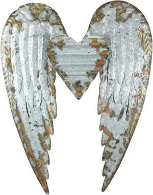 Rustic Galvanized Grey Stamped Metal Angel Wings and Heart Wall Sculpture - Artistic Hanging Decor for Bathrooms, Bedrooms and Living Rooms - 27.5 Inches High