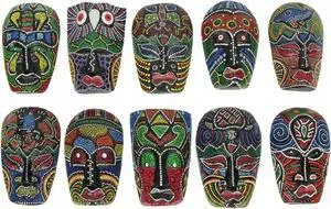 Set of 10 Hand-Carved 5-Inch High Tropical Dot-Painted Tribal Masks for Unique Wall Decor - Exquisite Artistic Craftsmanship - Vibrant Cultural Aesthetics